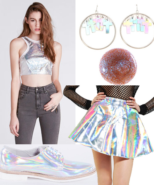 If you truly are a hologram hoarder, get all decked out in true futuristic style. Choose a crop top and skirt for all those special nights out and glam it up with bold accessories like holographic nails from SpaRitual or fun and funky Oxfords.