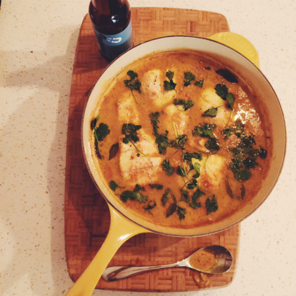 Anyway, I’ll save you my gluten drama and just say this stuff is awesome. It’s the secret kick in this curry which may have a handful of ingredients, but is incredibly easy to pull together. Feel free to play with your protein choice, or even replace the fish with veggies if you don’t eat meat. If gluten isn’t a problem for you, I’d recommend a pile of grilled sourdough to mop this up, or if you’re like me-just drink the curry straight!
